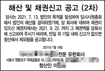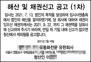 해산공고 양식과 절차 2021.07.19 머니투데이